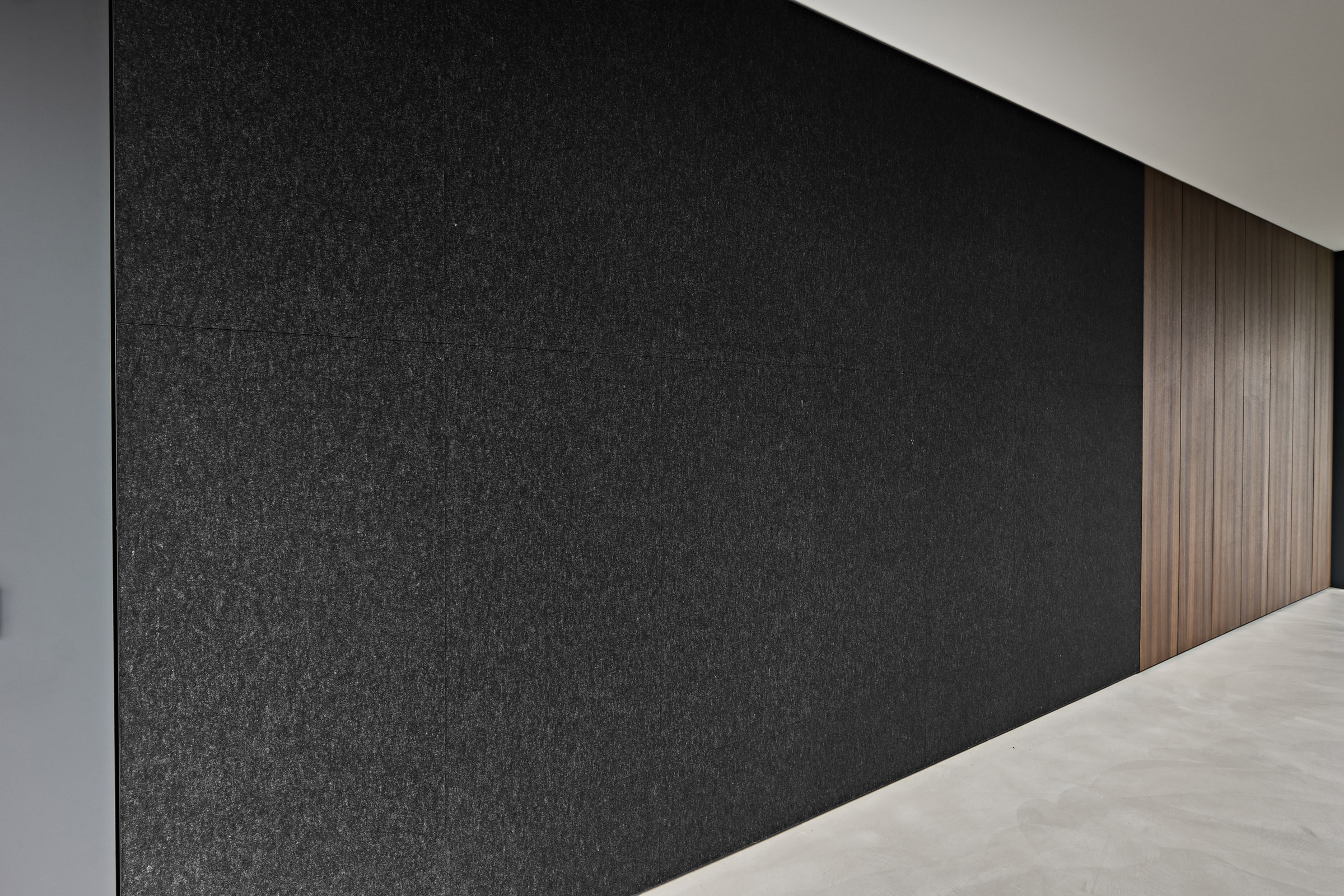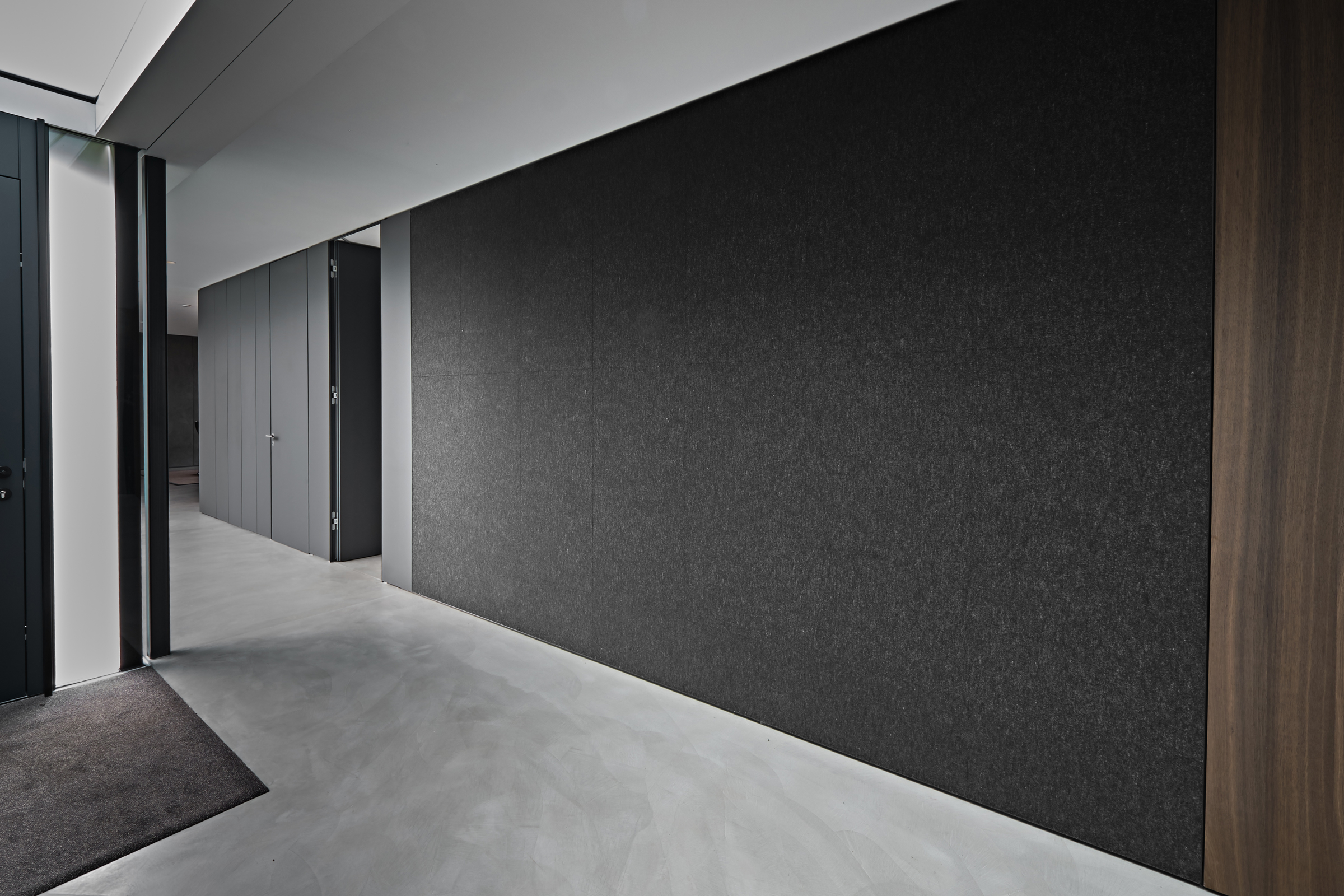 Auf dieser Basis wurden die mit Wollfilz kaschierten Nitona-Platten präzise montiert und mittels verdeckter Nagelung befestigt. Das Ergebnis ist eine technisch anspruchsvolle und zugleich gestalterisch hochwertige Wandlösung, die sich nahtlos in das architektonische Gesamtkonzept einfügt.